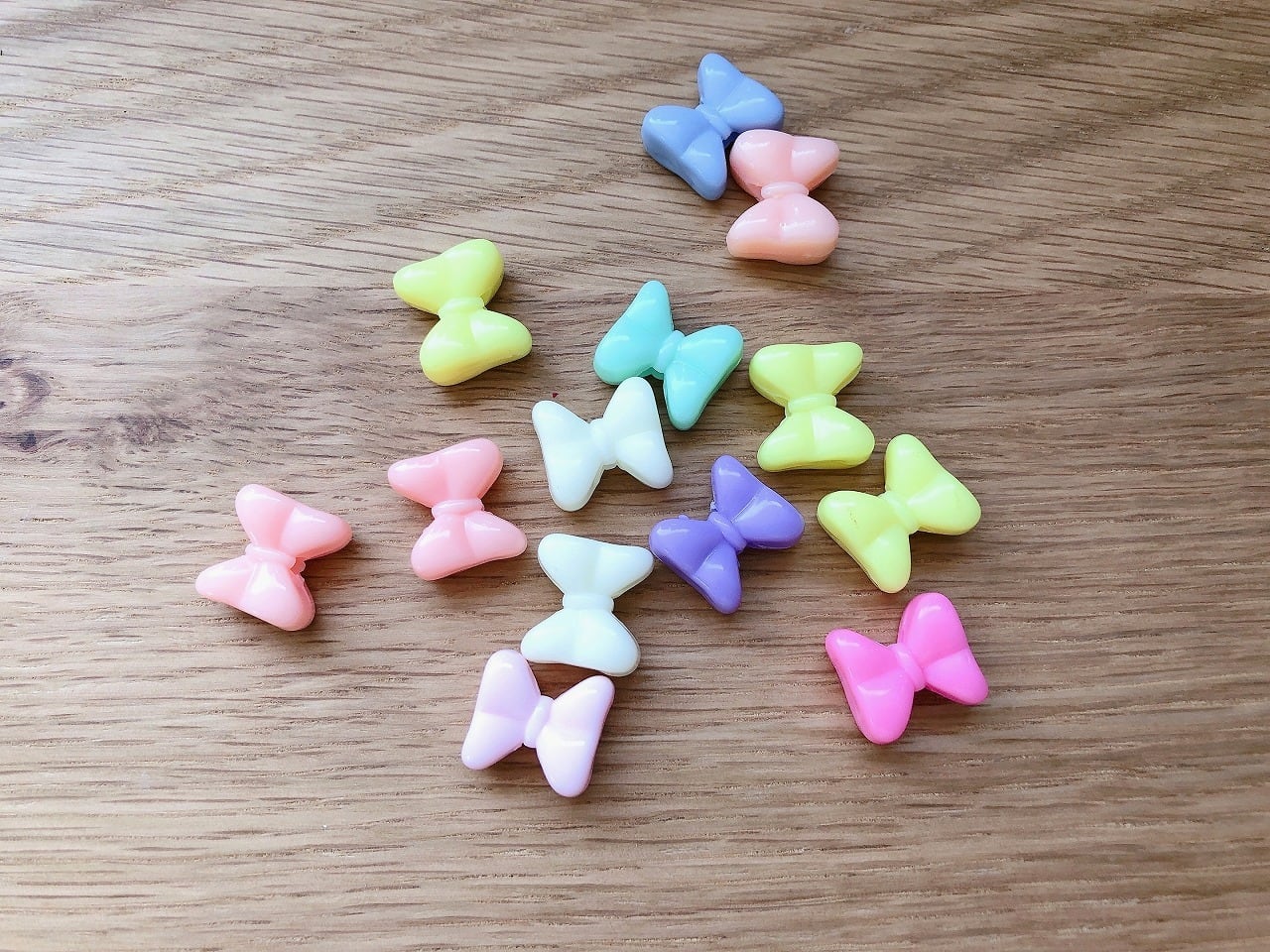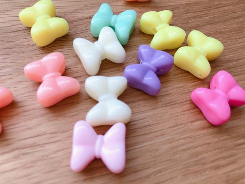リボンビーズ 5個セットです。 サイズ: 約15mm × 13mm × 厚さ8mm、穴 2.5mm ※ 色は選べません。 ★送料や注意点、発送の流れなどはABOUTのページに記載しておりますので、必ずご確認の上ご注文くださいますようお願いいたします。